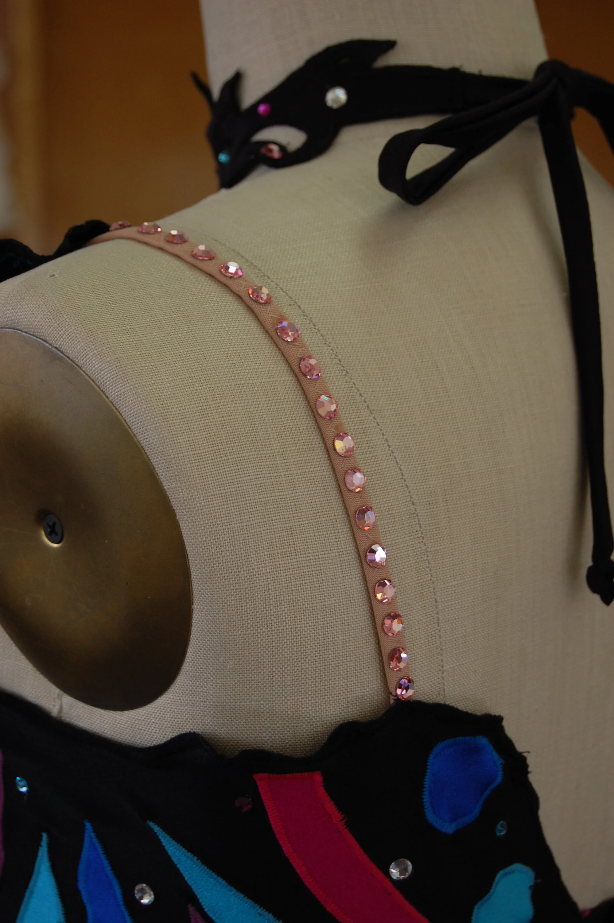 The bodice of the costume is constructed over an existing bra to maximize comfort and support for the dancer. Each of the bodice panels is in the shape of a butterfly wing. The original bra straps were removed and replaced with skin tone straps with rhinestones applied to them.
