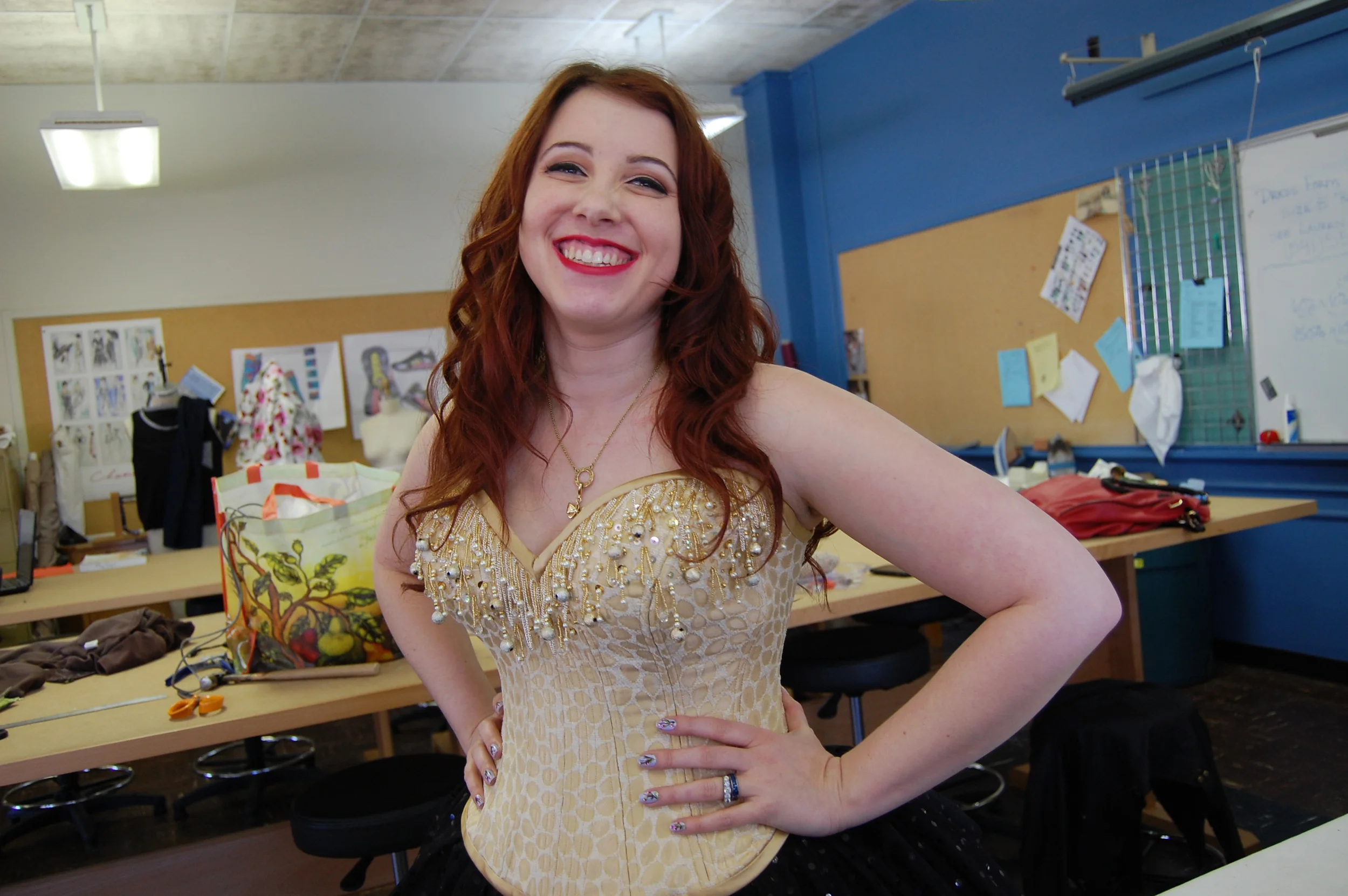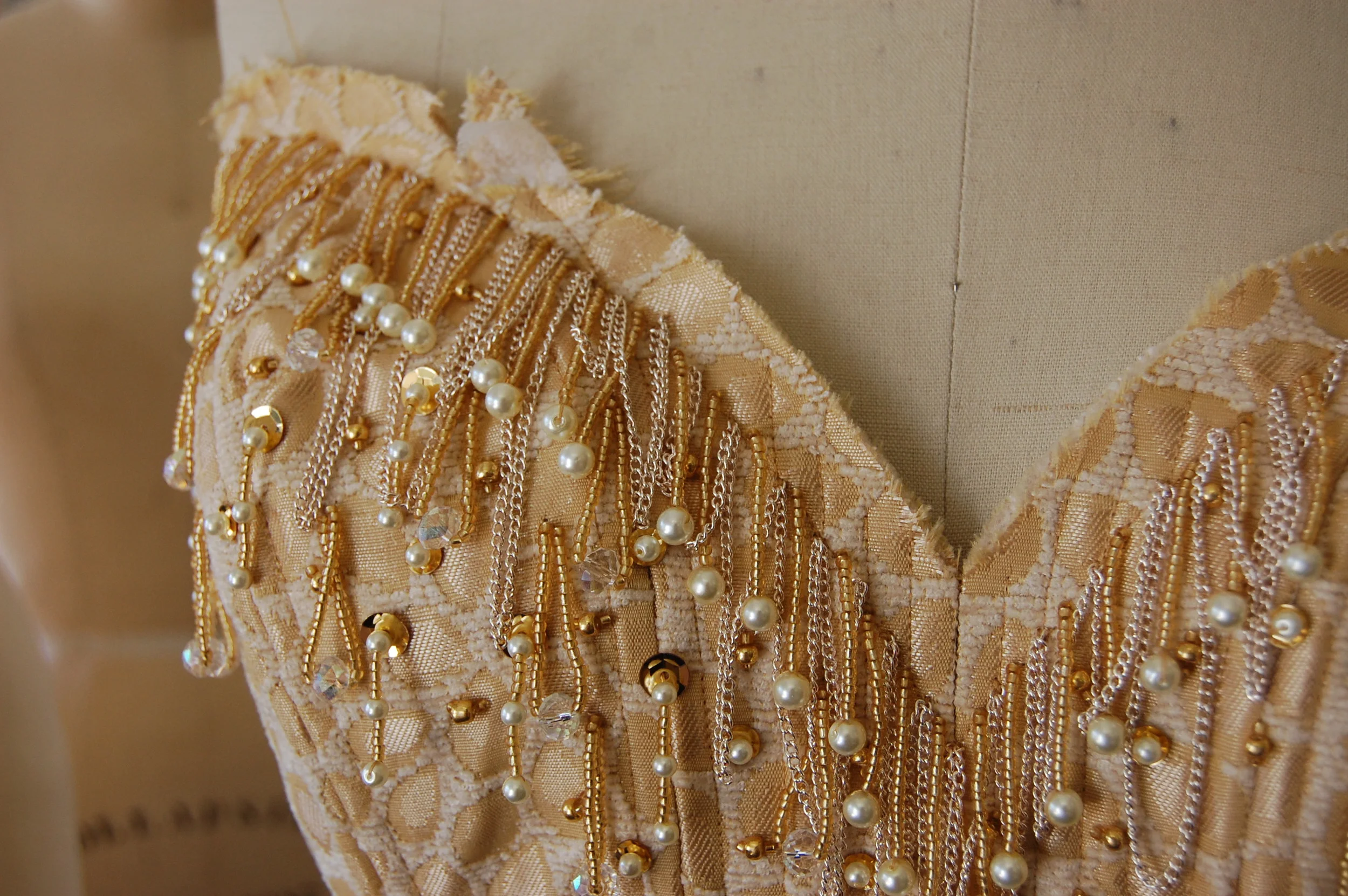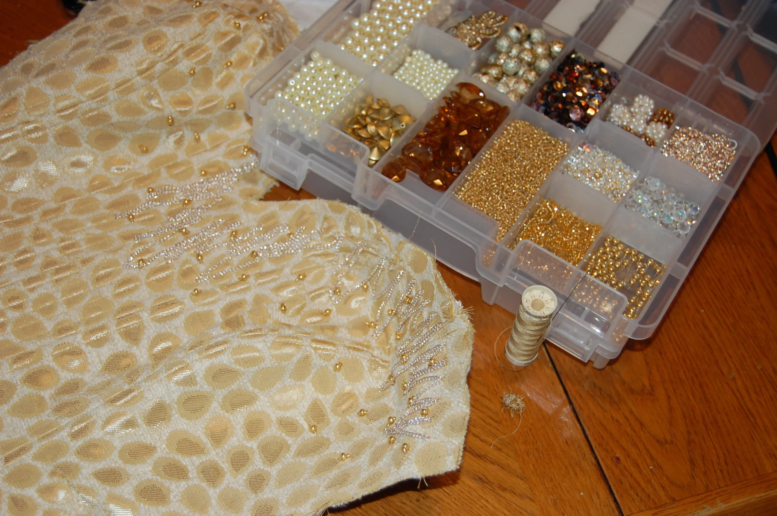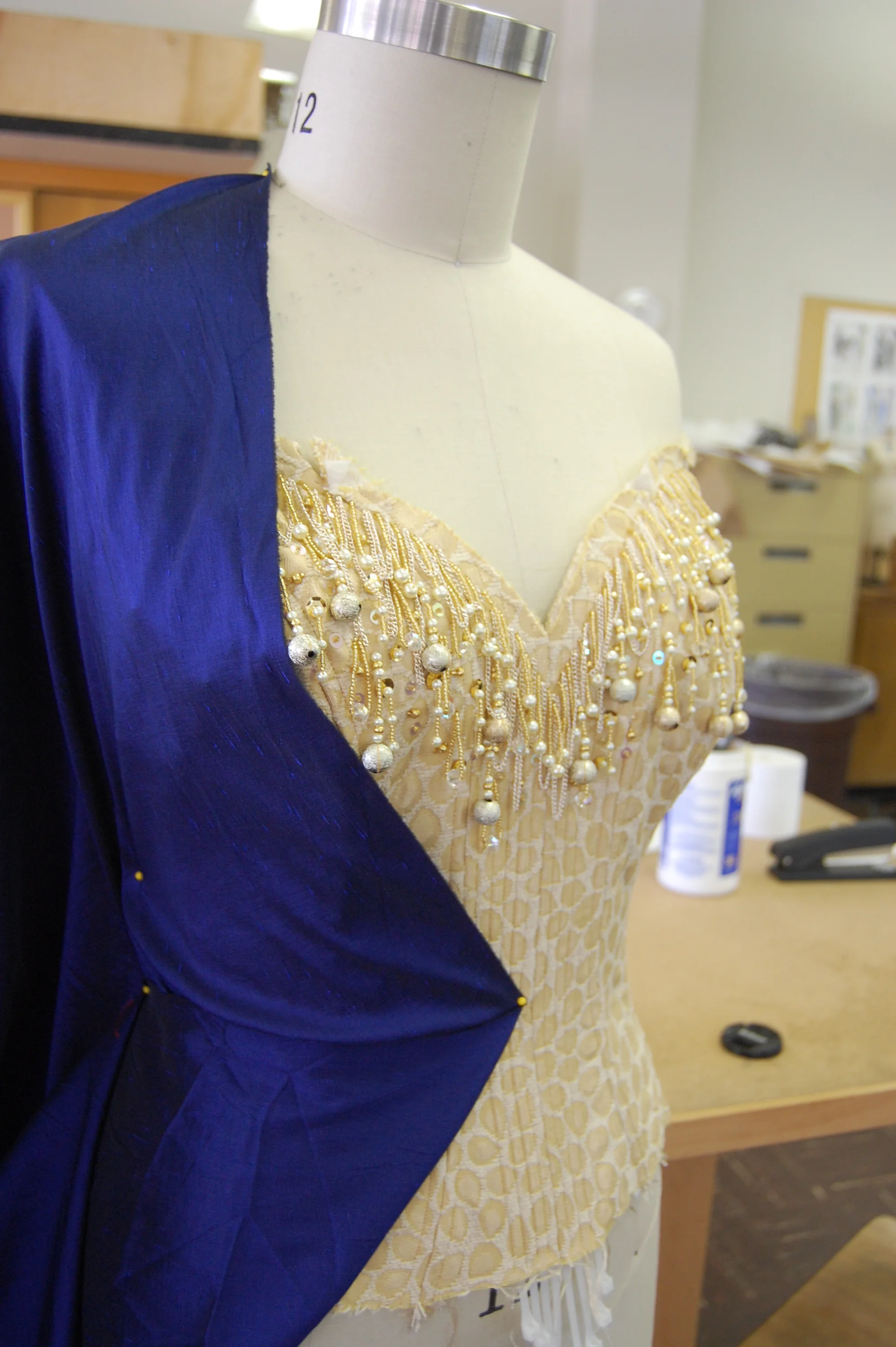 The corset was drafted using flat patterning techniques. It includes a built in padded bra, hand beading and a flannel lining. The gold fabric was a special order fabric from JoAnns that I fell in love with. The fabric has a small chenille weave and decorative satin weaved sections that provide really pretty texture in person. The corset is fully boned with a combination of flat steel and plastic zip ties. The decorative beading was all done by hand. One of my favorite parts of the corset is the lining: a silly printed flannel with happy smiling whales on it :)
