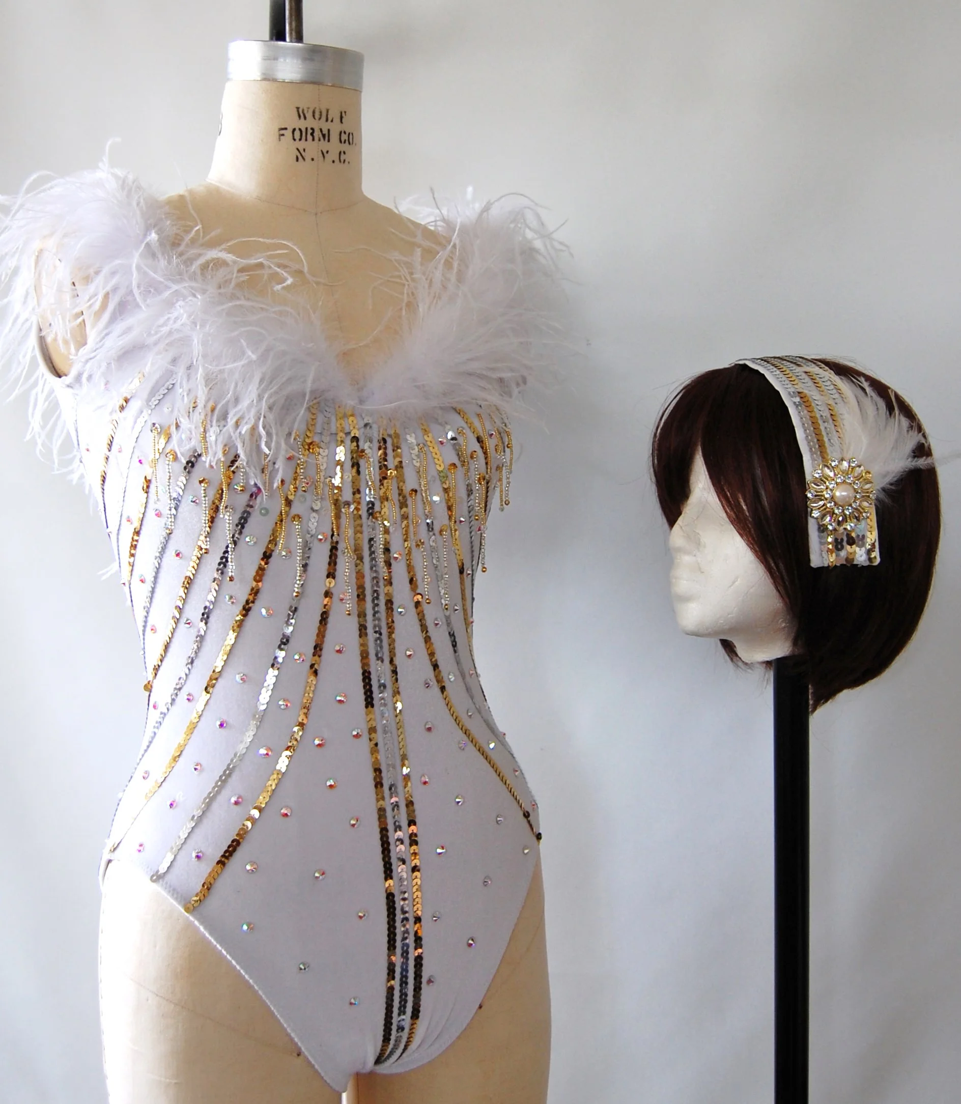 The headpiece is white taffeta built over a purchased headband and decorated with a purchased brooch. The sequins were applied in the same manner as the leotard.