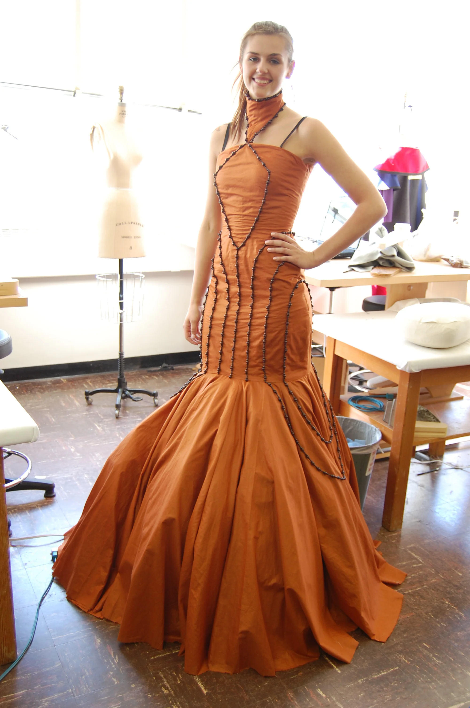The purpose of this design project was to evoke the infinite nature of the tree ring through surface embellishment on a evening gown. The design was achieved using hand beaded strands of wooden beads in a oval formation on the sides of the gown. This not only reflected the concentric nature of the tree ring but also provided unique design detail.